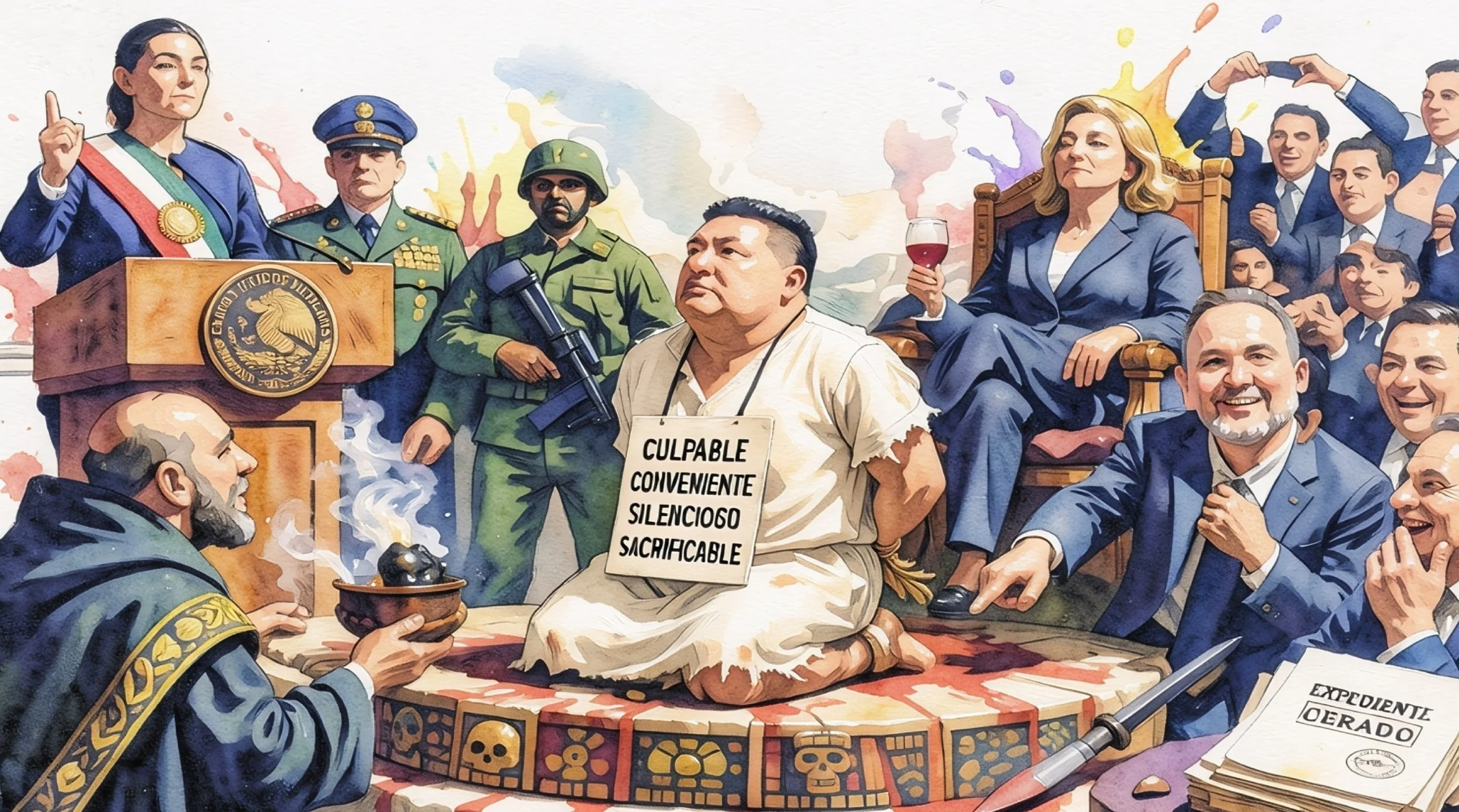 En esta sucia trama, el blanco de culpas (jurídico), la cabeza de turco (histórico e ibérico), el chivo expiatorio (campirano), la víctima propiciatoria (lírico) o sacrificial (azteca), el paganini (melódico), la mano del gato (felino), el que puso la cara (cristiano), le bouc émissaire (políglota), el inmolado ritual (religioso), el expiador (místico), indebidamente, ha sido Jáuregui. Porque los únicos responsables —responsables, responsables, lo que se dice responsables—, son uno de estos tres y en ese orden: la presidente Sheinbaum, el Ejército o María Eugenia; Jáuregui —como los meros hombres— se limitó a cumplir con su deber y a callar, punto. Él ha debido aguantar a pie firme y en silencio un chaparrón que debería estar mojando a otros.